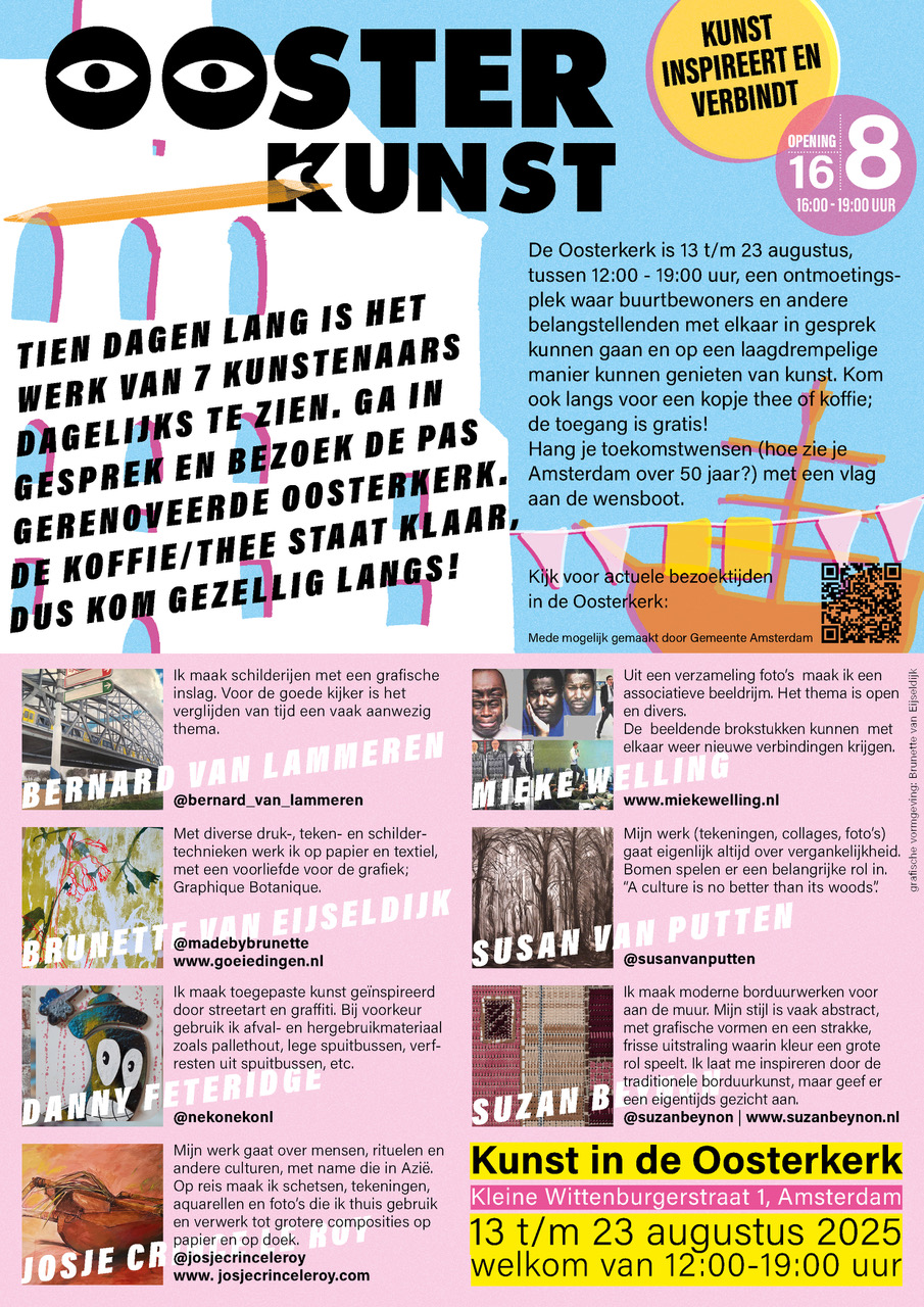 Oosterkunst in de Oosterkerk Tijdens Oosterkunst wordt de Oosterkerk een ontmoetingsplek waar buurtbewoners met elkaar in gesprek kunnen gaan en op een laagdrempelige manier kunnen genieten van diverse kunstvormen. Zeven kunstenaars tonen hun werk in deze inspirerende omgeving waarin ontmoeting, creativiteit en toekomstvisie centraal staan en elke dag zijn er kunstenaars aanwezig en sommigen zijn […]